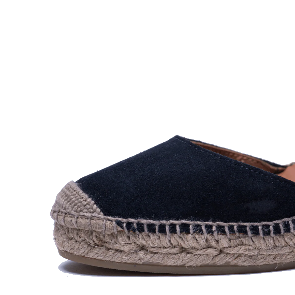 Zeppe in corda, 100% spagnole, con tomaia in pelle scamosciata blu, fodera in pelle e sottopiede imbottito. Retro in tessuto morbido e cinturino alla caviglia, regolabile, in pelle